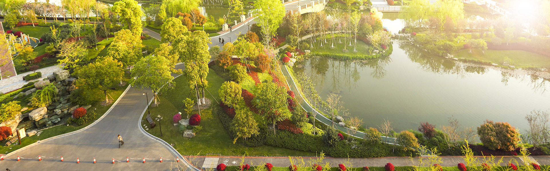 項目依地造景,南低北高,園區規劃以“自然,野趣,生態(tài)”為設計原則,精心打造逾60000㎡的濱水濕地景觀(guān)帶以及25000㎡生態(tài)果林。