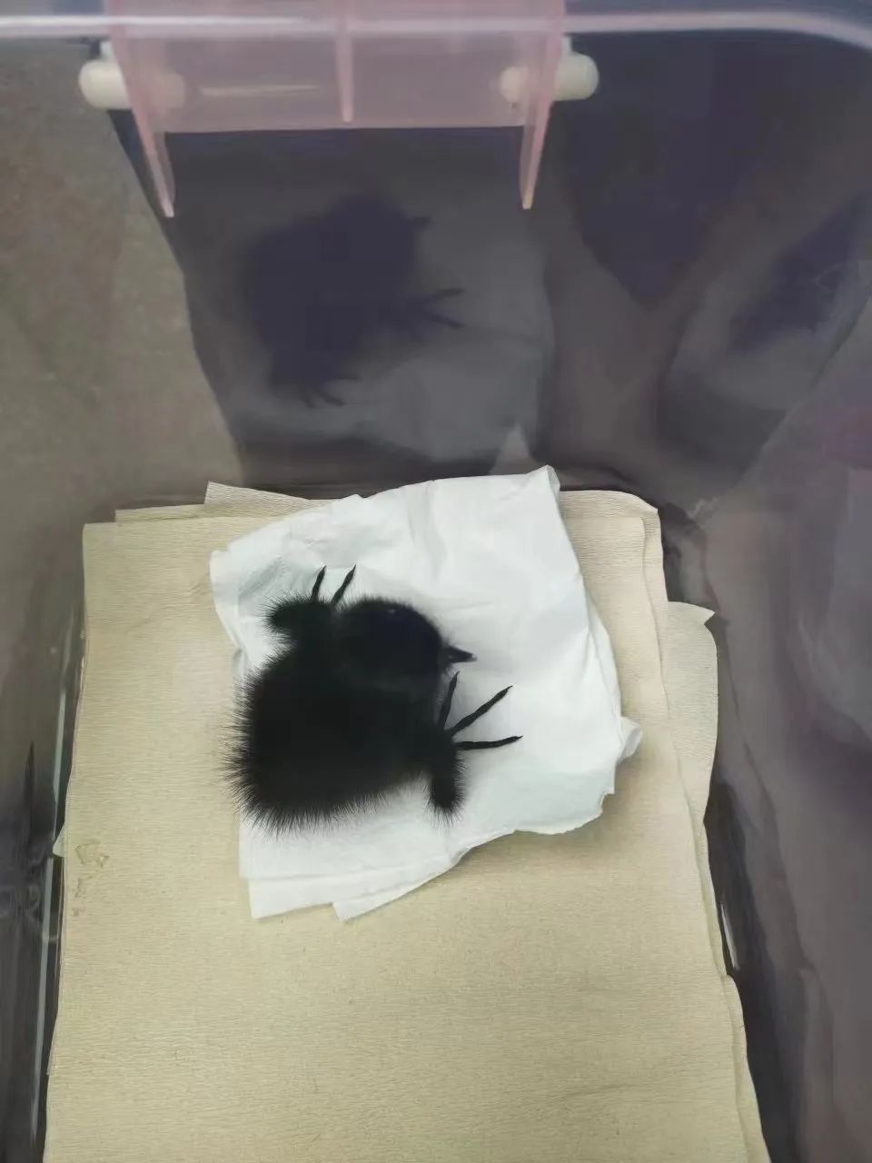 等待期間,袁何川將黑色幼鳥(niǎo)從草叢中小心捧起,將他放置在盒子中。小鳥(niǎo)似乎知道有人在幫助它,沒(méi)有任何反抗掙扎,只是轉動(dòng)著(zhù)它的大眼睛打量著(zhù)大家。