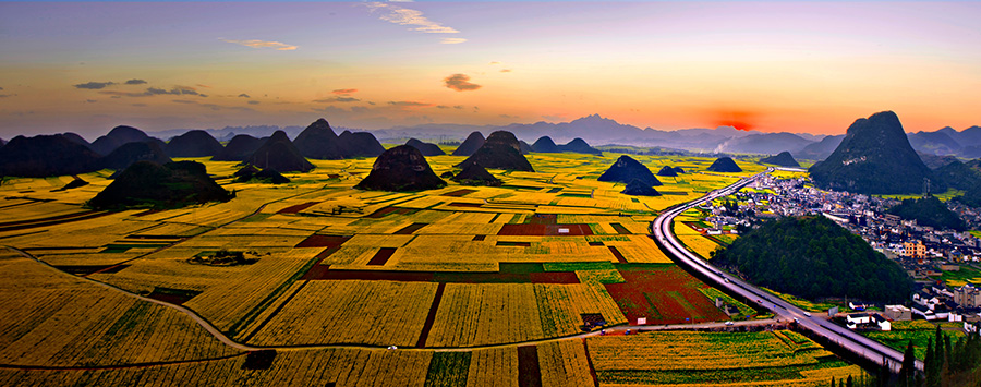 春風(fēng)十里,花海搖曳。坐在峰林上等待一場(chǎng)日出,俯視這翻滾的油菜花浪,隨金雞峰和日出一起起舞,融入100萬(wàn)畝花海中,成為一抹風(fēng)景。游客也可以坐上觀(guān)花火車(chē),穿越在花海之中,感受別樣美好春光。