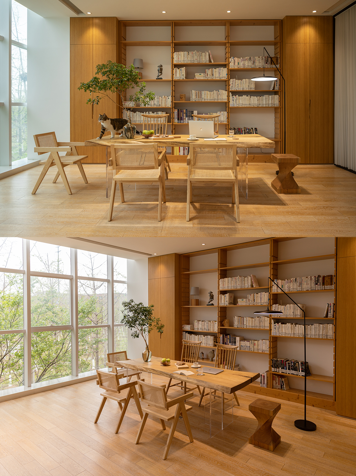 舍去一間小臥室,把大書(shū)桌放在客廳。做一個(gè)書(shū)墻,一面落地窗,養幾盆綠植。雨天的時(shí)候,開(kāi)一盞溫暖的燈,就著(zhù)一杯茶,可以發(fā)呆擼一天的貓。