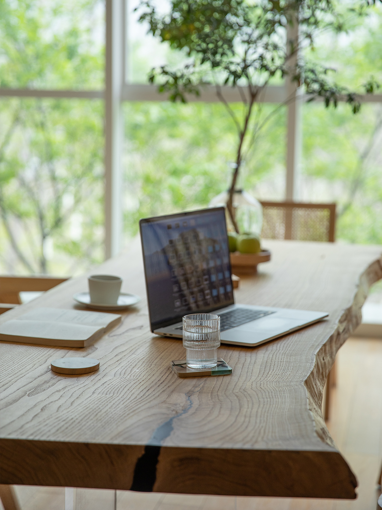 6??工作臺:實(shí)木大板桌--沉浸式工作學(xué)習必備。工作日下班回家,一家人在大長(cháng)桌上就餐嘮嗑,飯后又可以秒變書(shū)桌,孩子寫(xiě)作業(yè)看書(shū),大人加班搞事業(yè)兩不誤!周末的時(shí)候,陪孩子做手工、畫(huà)畫(huà)、插花...