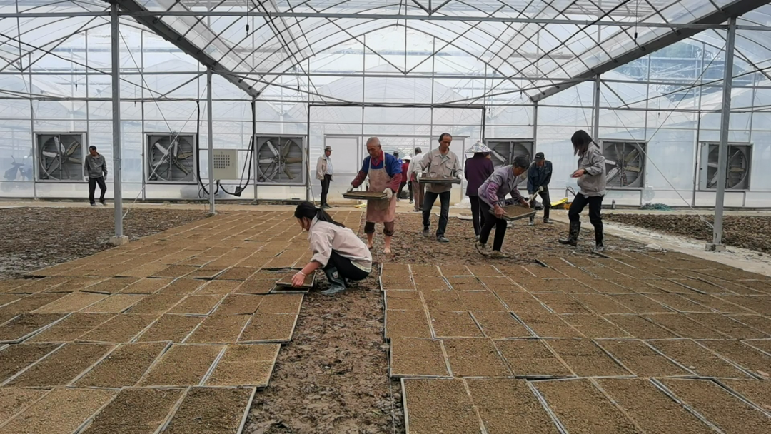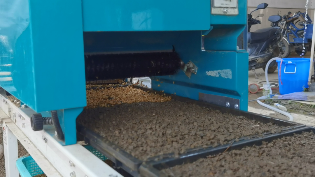 水稻種子需要先消毒,再經(jīng)過(guò)自動(dòng)秧盤(pán)機播種,最后運送到大棚里等待破土而出。20多天的生長(cháng)周期,種子破殼、冒芽,弱小的身軀推開(kāi)層層土壤,努力得向著(zhù)太陽(yáng)生長(cháng)。