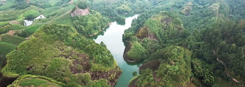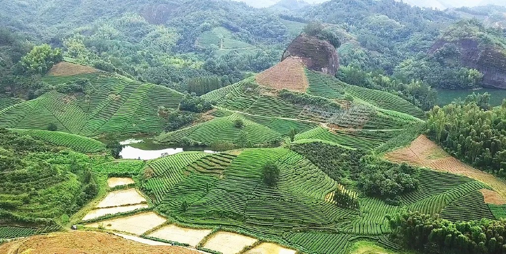陣陣清風(fēng),吹過(guò)一片片稻田;山野之間,一座座錯落有致的茶園綠意盎然,丹霞山馮、丘陵、果園、老屋……隱藏在一方綠意蔥蘢的小天地之中,隱約傳來(lái)“嘩嘩嘩”的溪水聲……