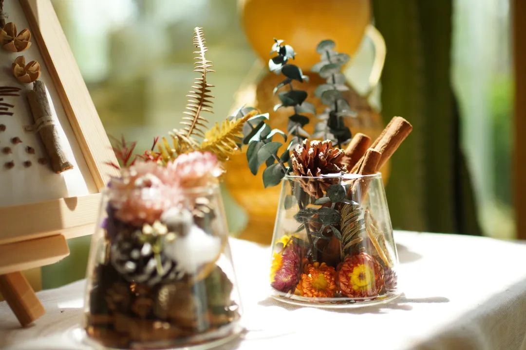 在銀杏林站-自然美學(xué)手作館,自然是永恒不變的探索主題,人們可以在此把從植物或動(dòng)物身上獲取的靈感,通過(guò)手作的方式二次創(chuàng )作成帶有個(gè)人審美情趣的美好之物,用以裝點(diǎn)生活。館內常態(tài)課程選擇有植物浮游瓶、玻璃押花、無(wú)火香薰杯、小花環(huán)、植物胸章,上手簡(jiǎn)單,形式多樣,選擇喜歡的手作方式來(lái)表達自己吧!