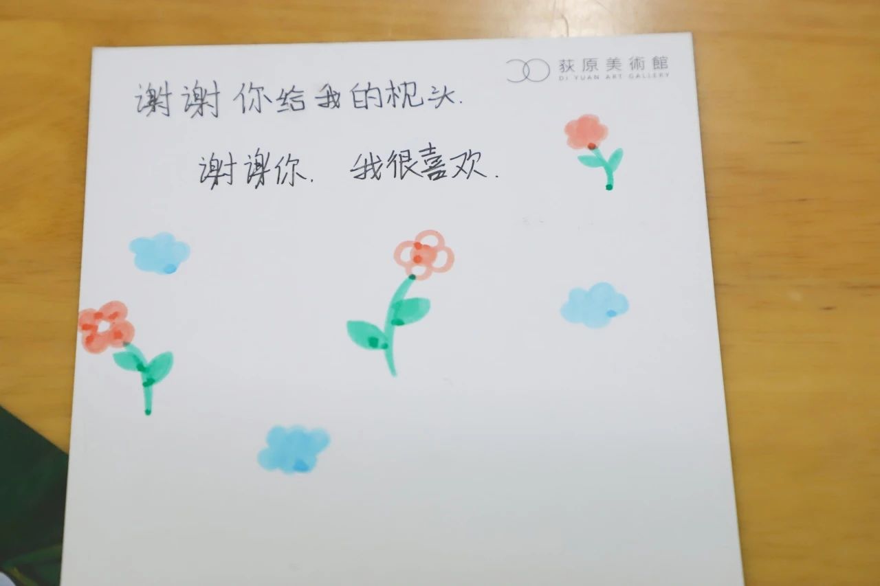 1月14日下午,荻原美術(shù)館工作人員帶著(zhù)小朋友們留存下的枕頭來(lái)到了嘉興市福利院,在福利院老師的協(xié)助下,向小朋友們送上了載著(zhù)“愛(ài)與夢(mèng)”的枕頭。而福利院的小朋友們也用稚拙的語(yǔ)言和繪畫(huà)表達了感謝,手寫(xiě)了一封“回信”。
